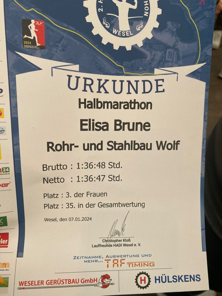 Im Rahmen des Hülskens Halbmarathon nahm unsere Mitarbeiterin Elisa Bruné unter unserer Flagge sehr Erfolgreich teil und konnte eine Super Zeit erlaufen von 1:36:48 STD.